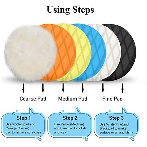 Facili da usare: possono essere utilizzati in tamponi elettrici come lucidatrice a doppia azione, lucidatrice rotante, lucidatrice ad aria, levigatrice orbitale casuale e altre lucidatrici. Con chiusura in velcro sul retro, è possibile sostituire facilmente la spugna. Si consiglia di lavare con acqua pulita e asciugare naturalmente dopo l'uso. È anche possibile utilizzare la spazzola per pulire le spugne.