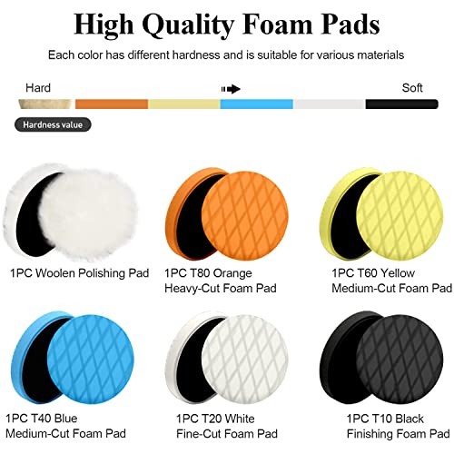 Compounder, lucidatura e cera: ci sono 6 diversi cuscinetti in spugna di alta qualità e cuscinetti in lana che faranno brillare la vostra auto. Orange Heavy Cut Pad per rimuovere strati di ossida