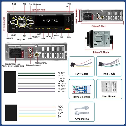 Autoradio 1 Din Bluetooth Auto Stereo Autoradio con Vivavoce Bluetooth FM Radio/USB/TF/Aux in/RCA/40 EQ/7 Colori/APP Localizza l'auto/Assistente Vocale Lettore MP3 con Telecomando Ricevitore Autoradio
