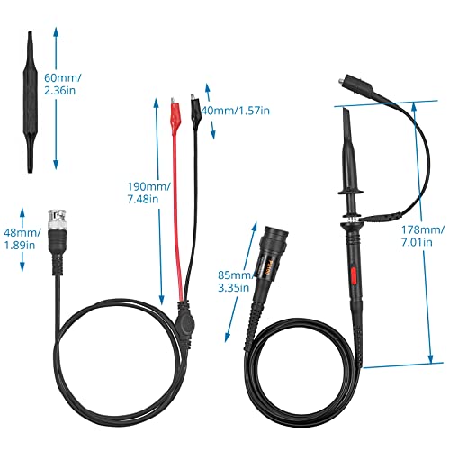 【Affidabilità】L'attenuazione della sonda dell'oscilloscopio può essere regolata con un interruttore a scorrimento 1X o 10X. La clip a coccodrillo con messa a terra mette a terra in modo affidabile lo stadio della sonda per un funzionamento sicuro e una corretta lettura del segnale. Voltaggio: 500V. e Corrente: 5A.