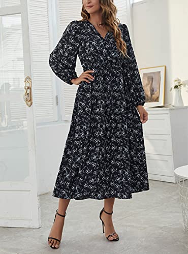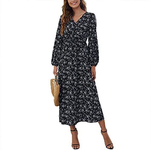❤Design: abito a maniche lunghe in vita stampato con scollo a V, scollo a V modifica la linea tra il collo, il design in vita evidenzia il rapporto di elasticità della linea di cintura, la gonna lunga e ampia è elegante e flessibile e il tessuto è leggero e confortevole. È adatto per vacanze casual e appuntamenti quotidiani.