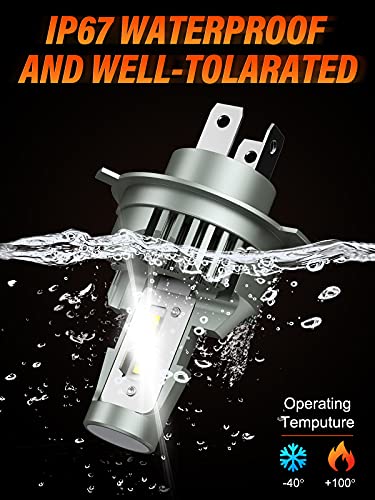 【Alta Potenza】:Lampadine H4 LED, 6500k luce bianca fredda, nessuna zona cieca. perle di lampade evidenziate importate, design della sorgente luminosa ad alta luminosità, messa a fuoco delle luci, qualità stabile, ampia superficie di emissione della luce, alta luminosità, luci brillanti rendono la notte come il giorno, maggiore luminosità rispetto ai normali fari alogeni. Grado di impermeabilità IP67.