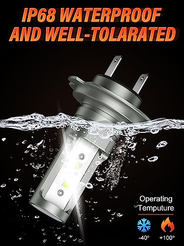 【Alta Potenza】:Lampadine H7 LED, 6500k luce bianca fredda, nessuna zona cieca. perle di lampade evidenziate importate, design della sorgente luminosa ad alta luminosità, messa a fuoco delle luci, qualità stabile, ampia superficie di emissione della luce, alta luminosità, luci brillanti rendono la notte come il giorno, maggiore luminosità rispetto ai normali fari alogeni. Grado di impermeabilità IP67.