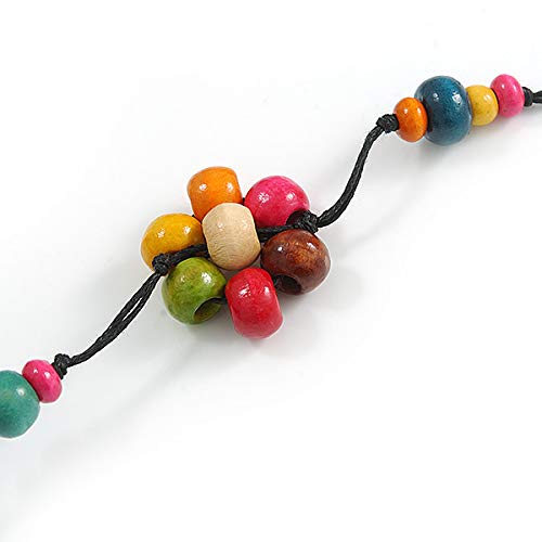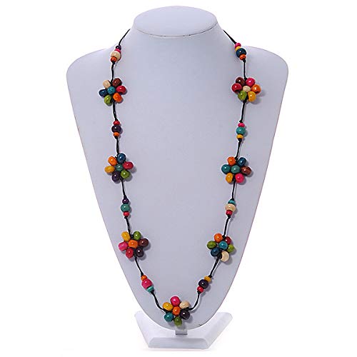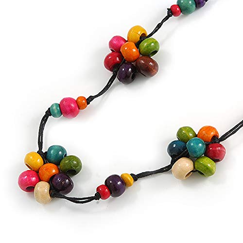 Avalaya - Collana lunga con cordoncino di cotone nero con fiori in legno, lunghezza 90 cm