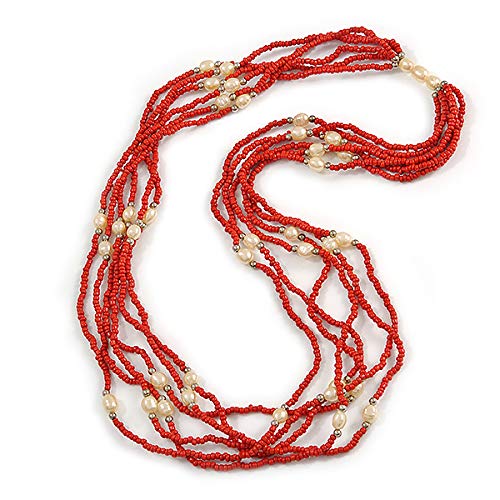 Avalaya Collana lunga multifilo in vetro rosso perlina finta crema, 70 cm L, Vetro