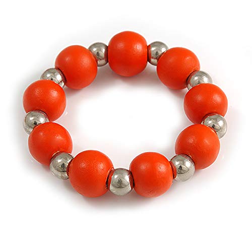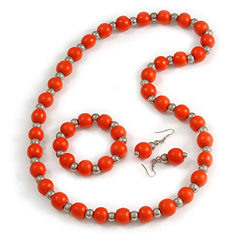 Avalaya Set di collana con perline acriliche in legno arancione e argento, orecchini, bracciale lungo 70 cm, Legno Plastica, Perline acriliche.