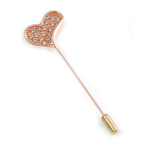 Avalaya Spilla asimmetrica a forma di cuore, con cristalli trasparenti, color oro rosa, con risvolto, cappello, vestito, smoking, collare, sciarpa, bastone da cappotto, lunghezza 65 mm