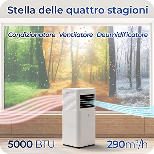 FUNZIONI UTILI PER L'UTILIZZO DI TUTTI I GIORNI - Questo condizionatore è progettato per essere utilizzato durante il corso di tutto l'anno per godere di un clima portatile. Modalità aria condizionata portatile per l'estate, modalità deumidificatore casa per l'inverno e modalità ventilatore per la primavera e l'autunno. Ha anche molte altre caratteristiche, tra cui un blocco bambini, un timer, un filtro lavabile e una memoria compatibile con smart-plug.