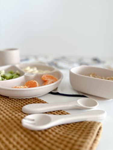 Stoviglie per bambini in silicone: queste stoviglie includono una ciotola, un bicchiere, un cucchiaio e una forchetta, tutti realizzati in silicone alimentare e privi di BPA. Ideale per bambini dai 6 mesi di età.