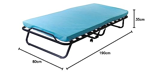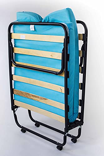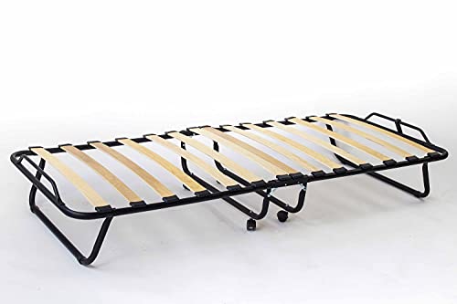 Letto per ospiti, pieghevole su rotelle, con telaio in metallo nero e con 14 listelli in legno multistrato. Dotato di un materasso a schiuma espanso di circa 7 cm d'altezza offre un piacevole confort per dormire. È comodo e molto veloce da montare. Ha 2 forti supporti davanti e dietro che si ripiegano per stabilizzarlo. Il letto ha un peso leggero e può essere spostato rapidamente su 4 rotelle. Capacità di carico: circa 90 kg