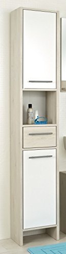 Armadio da bagno, con 2 ante a battente con entrambi 2 ripiani, 1 vano aperto e 1 cassetto. Design moderno ed elegante. Bello da abbinare con altri mobili della stessa serie "Julian" (vedi p.e. articoli: B019WEF4PU o B019WDYGB4 )
