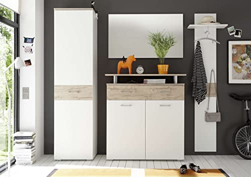 Guardaroba completo, Maniglie: ottica di aluminio, 1 x armadio: 1 anta, 1 bastone appendiabito, 2 vani, 1 x scarpiera: 2 ante, 1 cassetto, 1 vano rialzato, 3 vani, 1 x panello attaccapanni: 1 vano per cappelli, 1 bastone appendiabito, 4 ganci, 1 x specchio