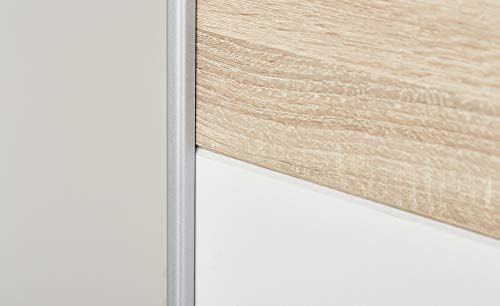 Materiale: Corpo in legno laminato di colore bianco, ante in bianco con decoro in laminato di quercia Sonoma. Stabile e resistente. Ripiani aggiuntivi da acquistare, vedi articolo: B0859BQTXZ.