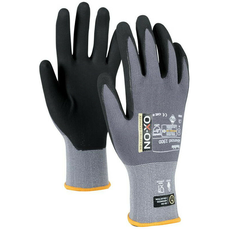 Guanto antitaglio OX-ON Flexible Advanced 1900 Approvazione/standard: EN 388:2016 Proprietà: - Estremamente resistente - Funzione touch - Ottima vestibilità - Eccellente sensibilità tattile - Traspirabilità unica - Presa sicura e precisa - Senza silicone - Approvazione per alimenti - Trattato con il processo Sanitized - Certificato OEKO-TEX® Materiale: 45 % nylon. 40 % nitrile. 15 % elastan Colore: grigio-nero