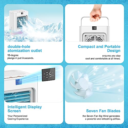 Condizionatore Portatile Tutto in Uno -- Il mini condizionatore portatile converte l'aria calda in aria fredda aggiungendo cubetti di ghiaccio/acqua e spruzza una nebbia d'acqua ultrafine con una dimensione media delle particelle di 4um attraverso vibrazioni ultrasoniche ad alta frequenza, ottenendo rapidamente l'effetto di raffreddamento e portandoti fresco e vento confortevole.