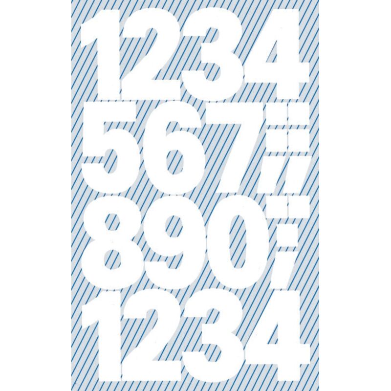 Numeri diversi. Per segnare i numeri in ufficio, a casa o a scuola. Resistente alle intemperie. Dimensione foglio 76x120 mm. Numero di fogli 2. Numeri 25 mm bianchi. Quantità: 10 set con 2 fogli.