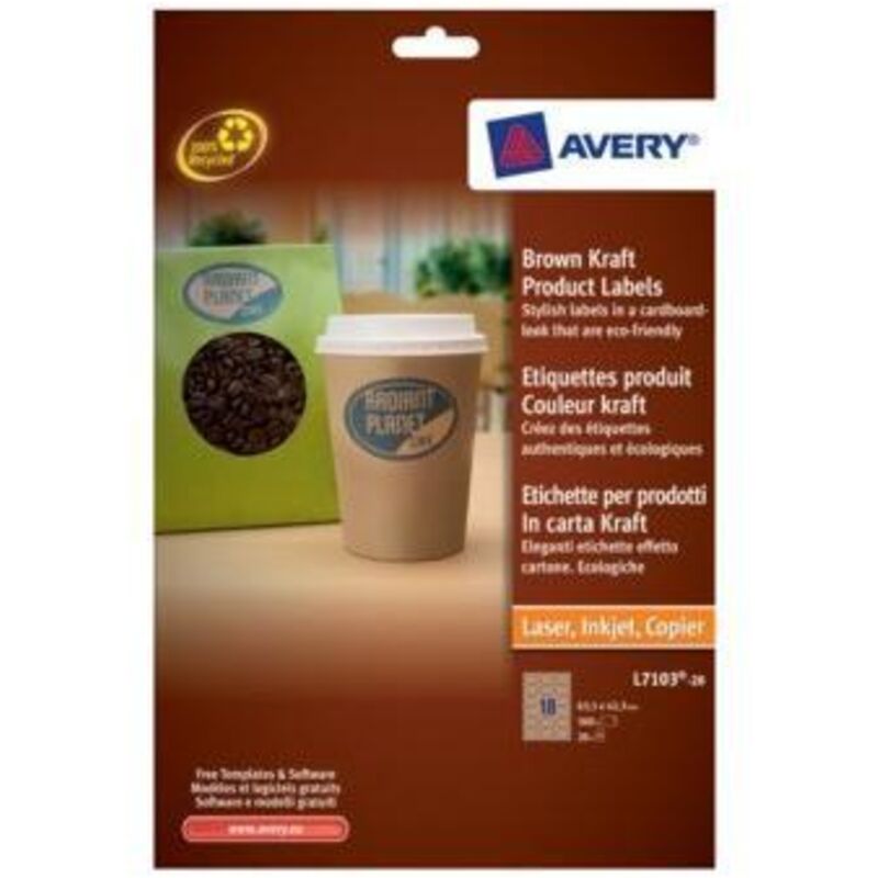 Avery Brown Kraft Product Labels. Colore del prodotto: Marrone, Tecnologia di stampa: A inchiostro, Materiali: Carta. Dimensione etichetta: 63.5 x 42.3. Dimensioni carta: 210 x 297 mm