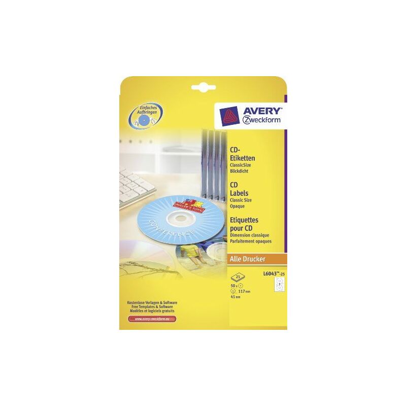 Avery Classic Size CD Labels. Colore del prodotto: Bianco, Materiali: Carta, Tecnologia di stampa: Laser. Dimensione etichetta: 117 x 117. Dimensioni carta: 210 x 297 mm