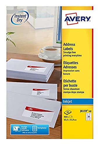 Avery Etichette autoadesive (24 per foglio) - 63,5 x 33,9 mm - Stampa a Getto d'Inchiostro, Bianco, j8159 Imballaggio: 40 fogli 63,5 x 33,9 mm bianco