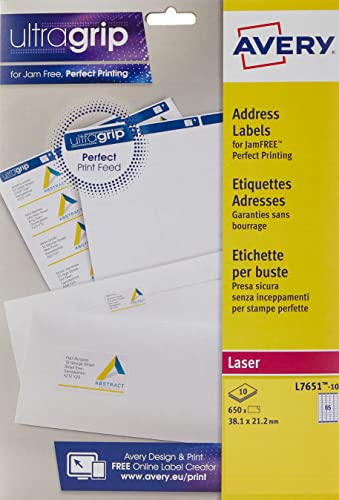Avery - Etichette autoadesive per indirizzi, stampanti laser, 65 etichette per foglio A4, 650 etichette, UltraGrip (L7651), colore: Bianco