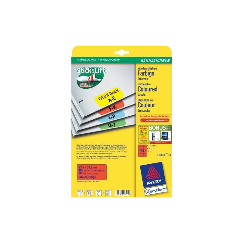 Avery L6034-20. Colore del prodotto: Rosso. Larghezza: 6,35 cm, Altezza: 3,39 cm. Materiali: Carta