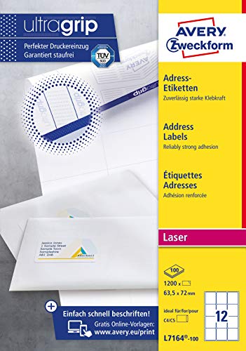 Avery Zweckform L7164-100 - Etichette adesive per indirizzi, 63,5 x 72 mm, 100 fogli per un totale di 1.200 etichette, bianco