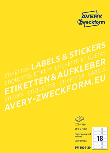 AVERY Zweckform PM1004-20 - Etichette di carta autoadesive (360 etichette adesive, 50 x 37 mm su A4, opache, universali, stampabili, permanenti), 20 fogli, bianco