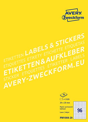 AVERY Zweckform PM1008-20 - Etichette di carta autoadesive (1.920 etichette adesive, 20 x 20 mm, in formato A4, opache, quadrate, universali, stampabili, 20 fogli, colore: bianco