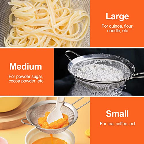【Ampia applicazione】 3 dimensioni di filtri a maglia fine sono ampiamente utilizzati, adatti per drenare o filtrare, molto adatti per tè, farina, caffè, riso, verdure, quinoa e fagioli e uno strumento indispensabile per lavori in cucina impegnativi.