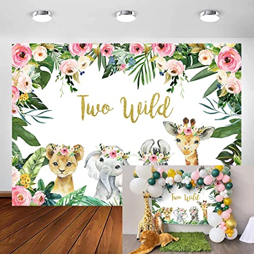 Avezano Sfondo fotografico in vinile per 2° compleanno, motivo: ragazza e due selvaggi animali safari della giungla, sfondo per ragazze, decorazione per la tavola di torte, dessert, 2,1 x 1,5 m