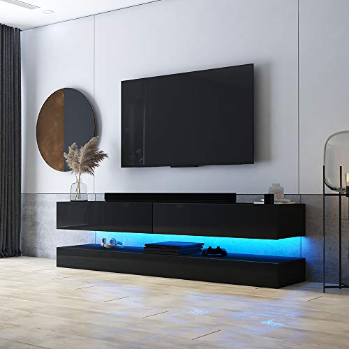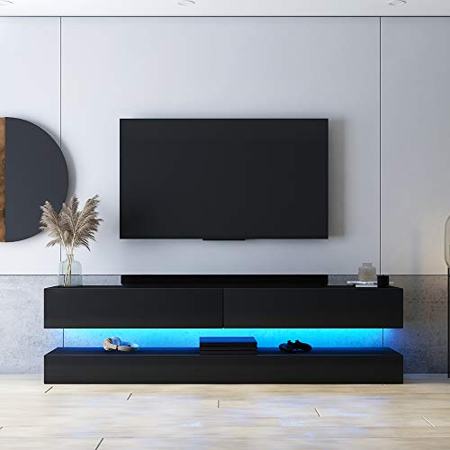 Aviator - Mobiletto porta TV sospeso/Supporto TV sospeso a parete (140 cm, nero opaco/pannelli frontali nero lucido con luci LED blu)