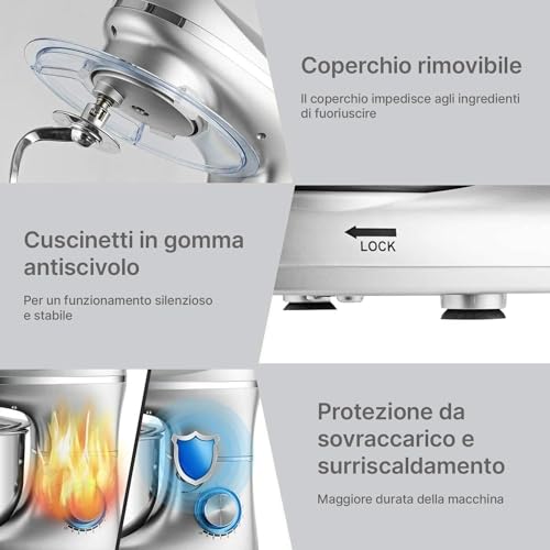 Potenza e velocità: L'impastatrice dispone di un potente motore da 1700W e offre 6 diverse velocità, oltre alla funzione pulse, per adattarsi alle tue esigenze di impasto.