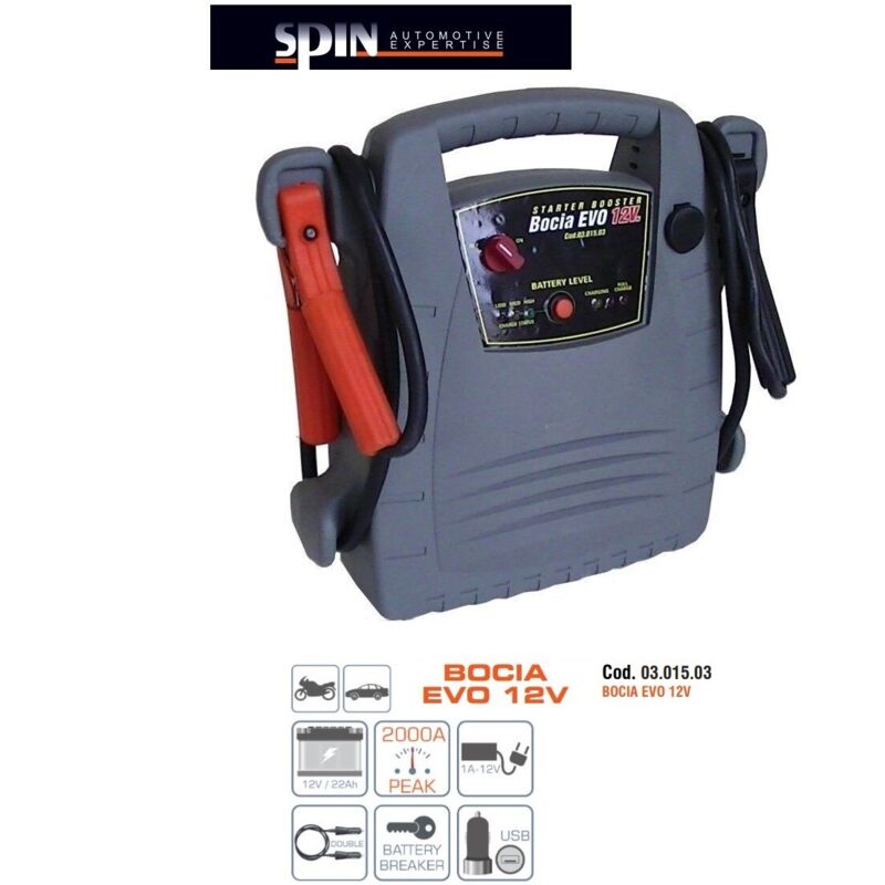 SPIN AVVIATORE D'EMERGENZA BOOSTER STARTER BOCIA EVO 12V 03.015.03 MODELLO - SPIN BOCIA EVO 12V CODICE ARTICOLO - 03.015.03 CONFEZIONE IN SCATOLA DI CARTONE COSA INCLUDE LA CONFEZIONE 1 SPIN AVVIATORE D'EMERGENZA BOOSTER STARTER BOCIA EVO 12V 1 CARICABATTERIE 1 Amp 100/240V 1 ADATTATORE USB 1 CAVO DOPPIO ACCENDISIGARI CONFEZIONE IN SCATOLA DI CARTONE DESCRIZIONE Nuova impugnatura ergonomica, Pinze con contatto in bronzo con treccia interna, Presa 12V, Controllo stato di carica (sotto carica), Controllo stato di carica (a riposo), Stacca batteria con allarme polarità invertita, Carica batterie 1 Amp 100/240V, Adattatore USB, Cavo doppio accendisigari, Nuova batteria 12V 22Ah / 2000A peak