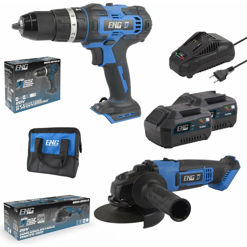 Trapano Avvitatore a Percussione + Smerigliatrice Angolare + 2 Batterie 4.0 Ah + Caricabatteria e Borsa Trapano Avvitatore a Percussione - ENG PRO - 1B20-AP40 Caratteristiche tecniche: Mandrino auto-serrante in metallo Alimentazione a batteria 20V Coppia di serraggio massima di 40 Nm 2 Velocità 0-400 / 0-1500 rpm Tasso di impatto 21000 bpm Luce a LED Velocità 0 - 1500 rpm Numero percussioni 1 velocità 0 - 6000 bpm Numero percussioni 2 velocità 0 - 21000 bpm Mandrino 2 - 13 mm Coppia massima 40 Nm Regolazioni frizione 16 Peso 2000 g - Smerigliatrice Angolare - ENG PRO - 1B20-SA12 Caratteristiche tecniche: Dischi compatibili: 115-125 mm Alimentazione a batteria ONE4ALL 20V Velocità di 10000 rpm Protezione anti-taglio Dado flangia M14 Impugnatura su 3 lati Velocità 0 - 10000 rpm Dischi compatibili 115 - 125 mm Dado flangia M14 Coppia massima 180 Nm Peso 2400 g