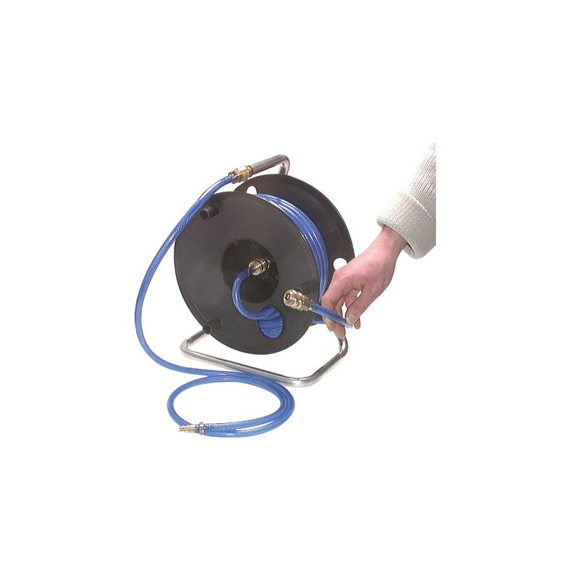Materiali: Materiale tamburo: plastica ad alta resistenza, telaio: tubo d'acciaio zincato, raccordi: Ottone Pressione di esercizio: 15 bar Intervallo di temperatura: -15°C a +60°C La fornitura comprende: Avvolgitubo completo di 20 metri di tubo TX rinforzato con tessuto e attacco rapido NW 7.2 in ottone montato con una sola mano Vantaggi: Possibilità di riavvolgere e srotolare il tubo durante il funzionamento Altre caratteristiche: Lunghezza del tubo (m) 20 Ø del tubo interno x esterno (mm) 9 x 15 Peso 4,2 kg / pz.
