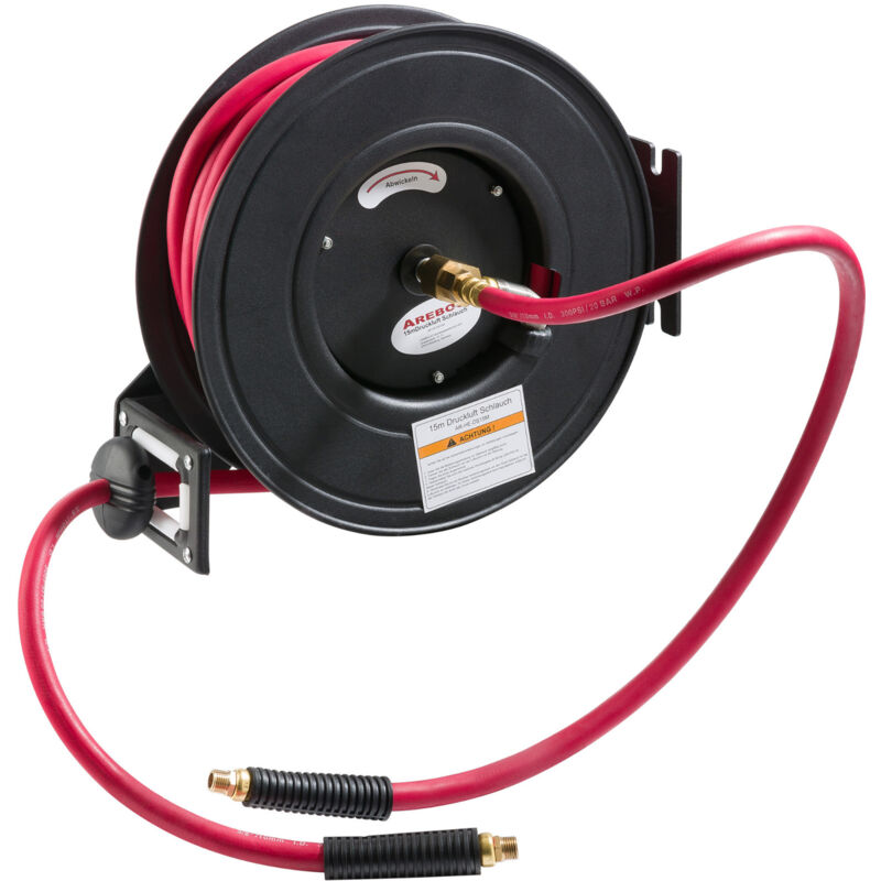 Funzione di auto-riavvolgimento Immediatamente pronto all'uso Funzione ferma-tubo Adatto all'istallazione su pavimenti, soffitti e pareti Il tubo ad aria compressa Arbeos da 15 m è idoneo a fornire aria agli strumenti pneumatici utilizzati nell'industria, nelle officine e nelle autorimesse. L'estremamente robusto rocchetto salva-spazio comprende un tubo per aria compressa di lunghezza pari a 15 m. La comoda funzione di auto-riavvolgimento rende il tubo facile da riporre dopo l'uso, e la funzione ferma-tubo aiuta a mantenere il tubo alla lunghezza desiderata. Il diametro interno è di 9,5 mm, il che permette al tubo di fornire il vostro dispositivo di aria in modo ottimale.Il rocchetto è completamente installabile su pavimenti, soffitti e pareti. Dati tecnici Temperatura di lavoro: -20° C a +65° C Raccordo aria compressa: 13 mm Dimensioni bocchetta: 6,35 mm NPT Peso proprio: 17 kg Entrata/uscita: 9,525 mm Max. pressione dell'aria: 20,68 bar (300 PSI) Max. flusso d'aria: 707,921 l/min