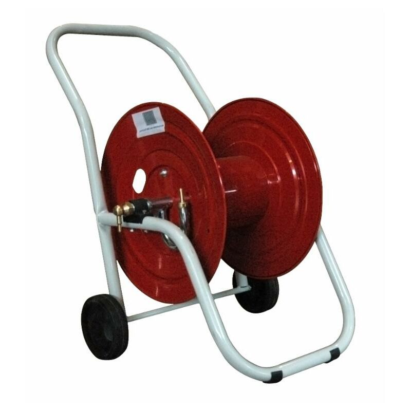 Avvolgitubo con base d'appoggio e manico 200 m. Dimensioni: 90x70x80, ruota in plastica diametro 200 mm. Struttura in ferro, albero centrale e maniglia in acciaio zincato, ingresso raccordo girevole in ottone Ø 8-13, uscita raccordo fisso in ottone Ø 8-13 Il prezzo si intende per 1pz