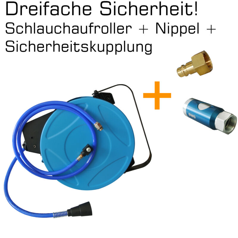 Ewo Avvolgitubo per aria compressa -Set con raccordo di sicurezza DN 7,4 e raccordo! Tubo in PU di alta qualità con inserto in tessuto per pressioni fino a 14 bar con raccordo di sicurezza secondo ISO 4414 e DIN EN 983 Caratteristiche dell'avvolgitubo: Avvolgitubo estremamente robusto Blocco automatico del ritorno Tubo in PU di alta qualità con inserto in tessuto, per pressioni fino a 14 bar Può essere utilizzato per aria e acqua L'alloggiamento e il tubo flessibile possono essere utilizzati in ambienti interni ed esterni Il braccio di montaggio rotante in acciaio, molto robusto, consente il montaggio a parete e a soffitto Dati tecnici: Alloggiamento In acciaio Braccio di montaggio orientabile a 180° Pressione nominale max. 14 bar Ingresso girevole G 3/8 temperatura massima - Peso: circa 8 kg Diametro interno del tubo spessore della parete 9,5 x 13 mm Lunghezza 12 m Campo di applicazione Aria e acqua Proprietà Giunto di sicurezza DN 7.4: Conforme a ISO 4414 e DIN EN 983 Massima
