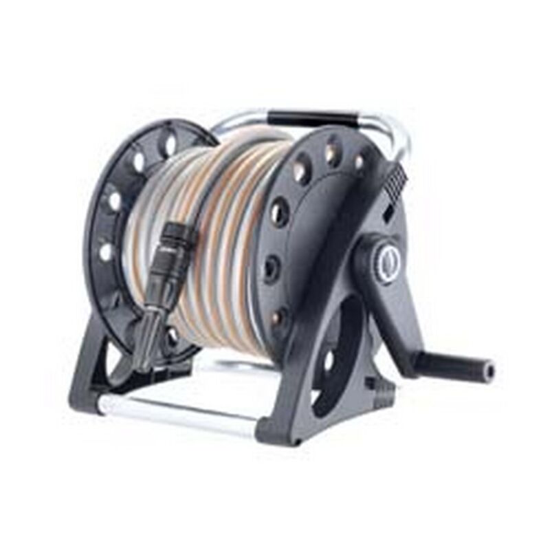 Avvolgitubo da parete aquapony con: 15 metri di tubo silver elegant plus ? 1/2' (12,5 mm), presa rubinetto 3/4' (20-27 mm) con riduzione 3/4' - 1/2' (15-21 mm), 4 raccordi automatici (uno con aquastop), lanciaspruzzo.