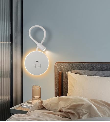 AWEKLIY Lampada da Parete a LED,Lampada da lettura flessibile da comodino a collo di cigno,con Porta di Ricarica USB,Luce ambiente camera da letto Luce notturna Faretto (3W 3000K+8W 6000K) Bianco