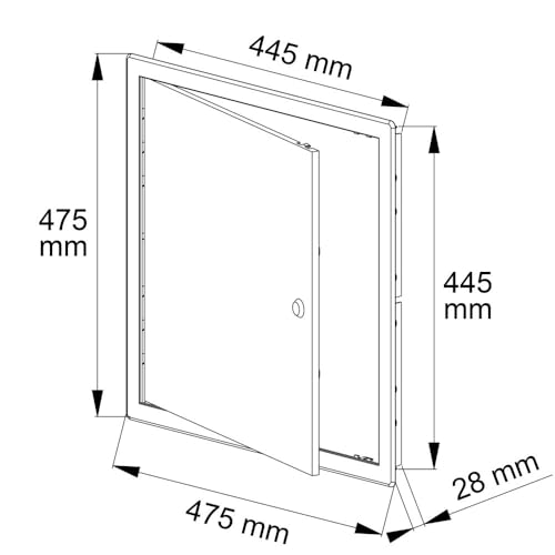 Dimensioni: le dimensioni esterne (larghezza x altezza) della porta sono 475 x 475 mm, le dimensioni interne (larghezza x altezza) 445 x 445 mm. Lo spessore è di 28 mm.