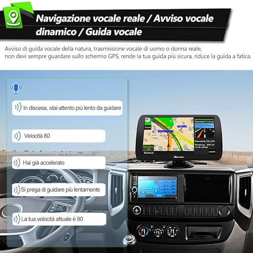 【Navigatore Satellitare Auto o Camion 9 Pollici】Goditi la reattività istantanea del touchscreen da 9 pollici. I colori naturali dello schermo offrono un'esperienza visiva piacevole e confortevole. Nota: Questi dati delle mappe sono esclusivamente offline e non includono supporto per mappe online.