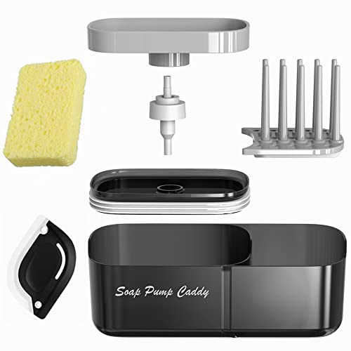 AwmnSrman Dispenser Sapone Cucina Porta Sapone Liquido Distributore di Detersivo da Cucina 300 ml 4 in 1 con Spugna e Spatola Sapone a Pompa con Supporto per Spugna Ricaricabile e Riutilizzabile Nero