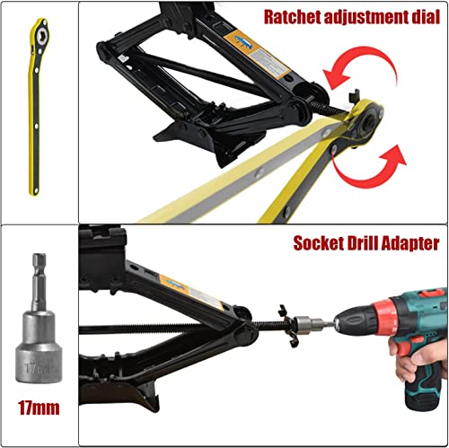 Due modi di utilizzo: il jack a forbice viene fornito con un adattatore per trapano plug-in e una chiave a cricchetto per regolare il jack a forbice su e giù. Ti aiuta a sollevare il tuo veicolo più velocemente con 2 strumenti di impugnatura.