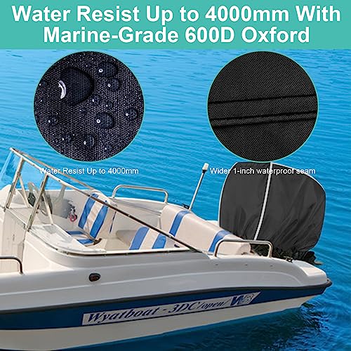 Materiale durevole - Copertura Motore Barca ha materiale Oxford marino 600D con rivestimento composito in PU, si adatta alla maggior parte dei motori fuoribordo 5-225 HP, eccellente per il rimessaggio all'aperto fuori stagione, l'ormeggio. Cuciture doppie di alto livello, tutte le cuciture nastrate possono migliorare la durata. Copri motore fuoribordo protegge il motore da pioggia, vento, neve, nebbia, polvere e graffi.