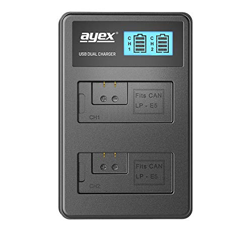 Ayex Caricatore USB doppio per batterie Canon agli ioni di litio tipo LP-E5 - Ricarica tramite presa USB, laptop, Power Bank o PC - Display LCD con indicatore di carica