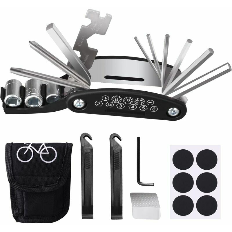 Kit di riparazione 16 in 1 - - Chiave esagonale a bussola 8/9/10/mm, cacciavite a testa piatta, cacciavite Phillips, asta di prolunga a bussola, chiave piena 8/10/15/mm, 2/2, 5/3 / Chiave esagonale da 4/5/6 mm, ruota a raggi. Facile da rimuovere e installare, facile da montare e smontare senza attrezzi. 【Qualità completamente migliorata】 È realizzato in acciaio inossidabile resistente e di alta qualità, accessorio funzionale più resistente, perfetto e più efficiente. Questo strumento per bici multifunzionale è portatile, leggero e l'accessorio perfetto per le riparazioni generiche della bicicletta. 【Facile da trasportare e comodo】Pieghevole e dotato di una borsa per il trasporto, tutti gli strumenti e gli accessori possono essere riposti lì, compresi gli accessori e altri piccoli oggetti. Il kit di attrezzi può essere riposto nella borsa, facile da trasportare per attività all'aperto o in viaggio. 【Ottima applicazione】 Adatto per riparare la maggior parte delle biciclette, come