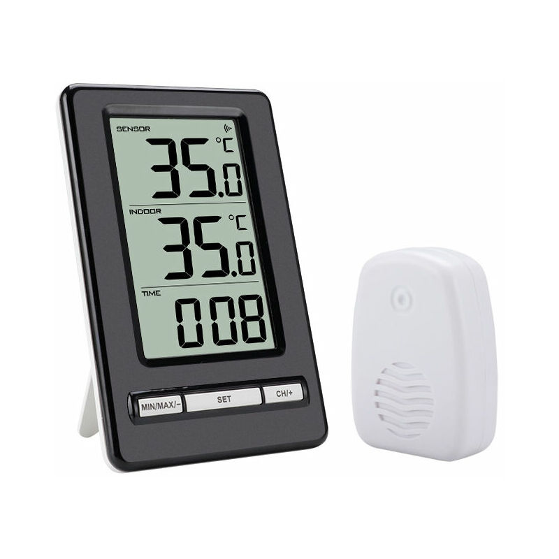 Visualizzazione simultanea della temperatura interna ed esterna con risoluzione base di 1°C. 【Temperatura interna】 Intervallo 0-60 ℃, precisione ±1 ℃, risoluzione 0,1 ℃. 【Temperatura esterna】 Intervallo -40-60 ℃, precisione ± 1 ℃, risoluzione 0,1 ℃ [Cambia unità - Seleziona le unità di temperatura Celsius o Fahrenheit nella guida del pulsante SET. Richiede 4 batterie AAA per l'alimentazione (non incluse) Dimensioni del prodotto: unità principale 12*7,5*1,5 cm, unità secondaria 6,5*5*2 cm Dotata di sensore wireless, può essere appesa o fisso / trasmissione wireless / distanza di trasmissione all'aperto 100 m Raccomandazione: si consiglia di montare il sensore in un'area ombreggiata su una parete esposta a nord. La luce solare diretta e le fonti di calore radiante causeranno letture della temperatura imprecise. Il sensore non è impermeabile ed è consigliabile installarlo in un luogo ben protetto. Utilizzare viti o chiodi (non inclusi) per fissare il sensore alla parete. Vendiamo solo il