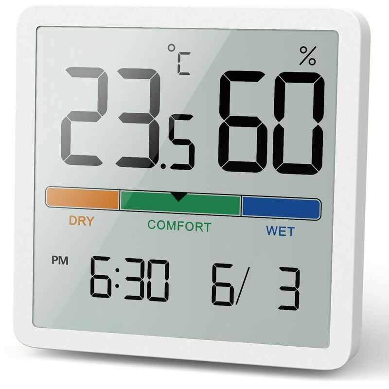 Grande schermo LCD da 3,34 pollici, lettura più chiara - Termometro igrometro per interni con schermo LCD da 3,34 pollici, cornice elegante e sottile, facile da leggere da qualsiasi angolazione e lungo raggio. [Indicatore della zona di comfort] Il Il simbolo indica condizioni asciutte, confortevoli e umide in base all'umidità dell'aria e alla temperatura interna. Può aiutarti a sentirti a tuo agio quando hai il tempo di regolare le impostazioni del termostato e dell'umidificatore o del deumidificatore. [Super portatile e 3 metodi di installazione] Il termometro digitale per interni ha 3 opzioni di installazione, che possono essere utilizzate per desktop, installazione a parete e magnete. Può essere appeso in modo flessibile, appeso al muro o in piedi, solo in casa, molto adatto per il monitoraggio in cantina o in garage. [Risposta rapida, alta precisione] Risposta rapida e valore di misurazione accurata aggiornato ogni 10 secondi, ampio intervallo di misurazione della temperatura