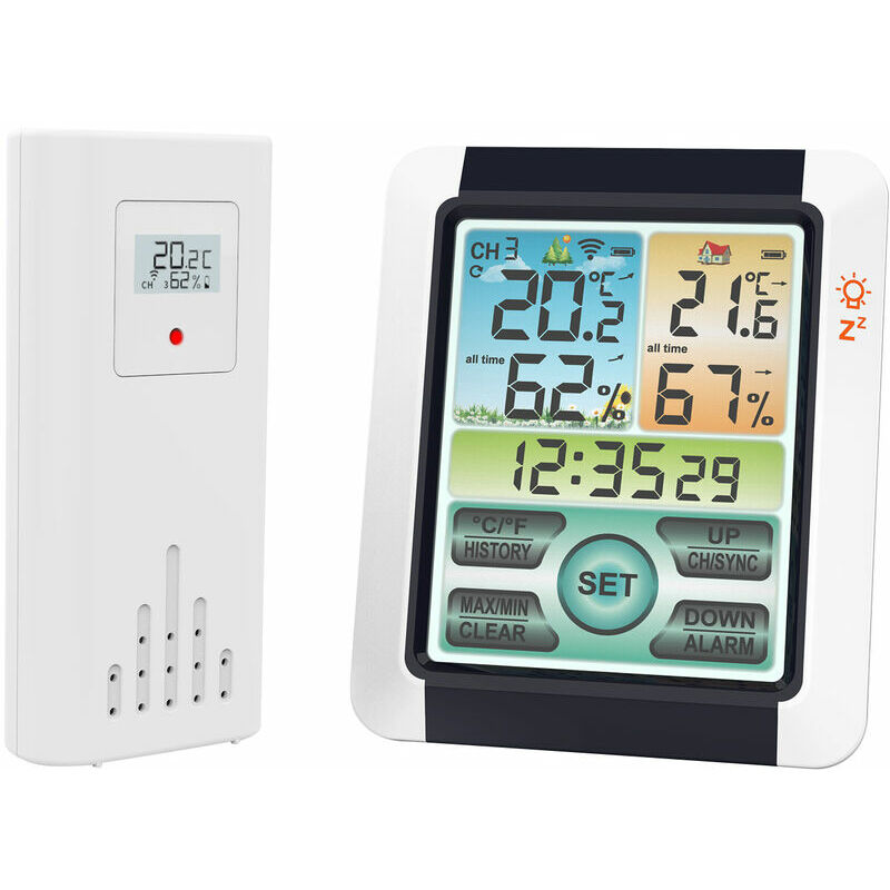 Design touch screen sensibile, facile da regolare. [Alimentato a batteria] Alimentato da 3 batterie AAA e 2 batterie AA (non incluse), veloce da usare, non necessita di frequenti ricariche, basso consumo energetico, lungo tempo di lavoro. [Facile da installare] Con fori per appendere sul retro, supporto da tavolo, design magnetico e tappetini adesivi, monitor del display e sensore esterno sono facili e flessibili da installare. Specifiche: Colore: bianco e nero < br/>Materiale: ABS Intervallo di temperatura interna: -4°F -- 158°F (-20° C--70°C) Intervallo di temperatura